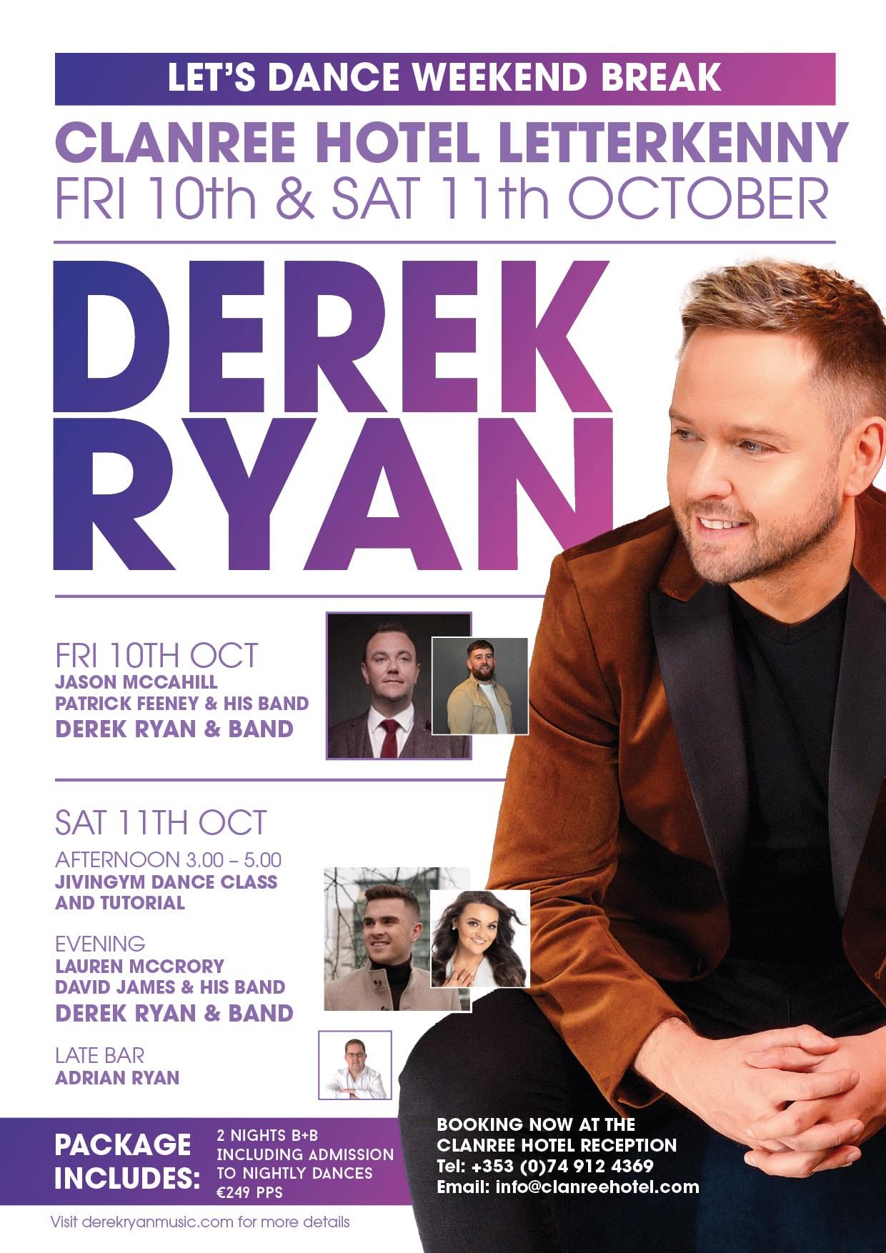 Packages €249pps available now to book through the Clanree Hotel Reception, including 2 NIGHTS B&B, PLUS ADMISSION TO ALL DANCES!