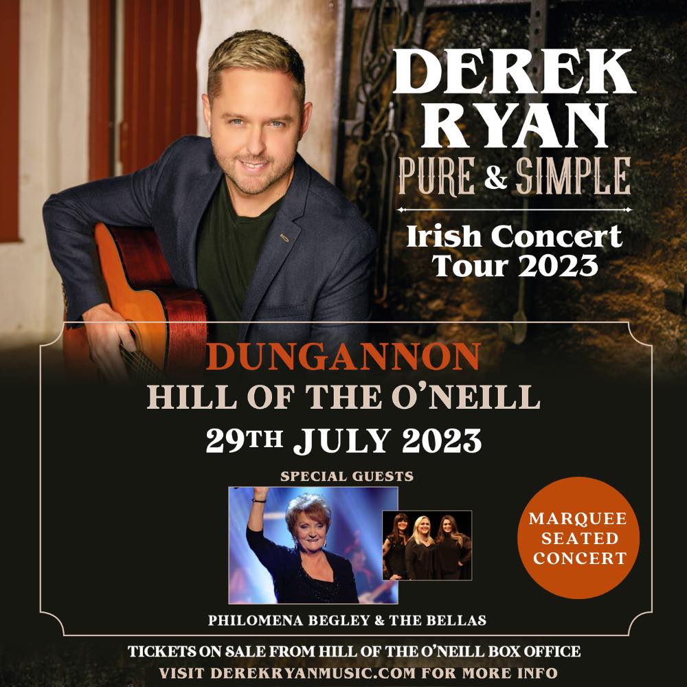 Derek Ryan is on a run of sell-out shows, kicking off his most successful concert tour to date at the start of the year. Due to the huge success and demand, Derek has just added a new show on his ‘Pure & Simple’ tour in Dungannon’s Hill of The O’Neill on Saturday 29th July. With support from very special guests Philomena Begley and local band The Bellas.