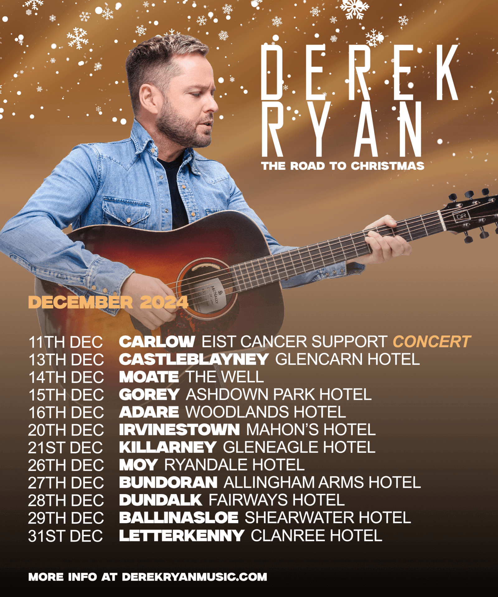 View Larger Image Derek is on ‘The Road to Christmas’ this December! See where Derek will be on ‘The Road to Christmas’ this December! By Richard|2024-11-25T15:51:09+00:00November 25, 2024|Uncategorized|0 Comments Share This Story, Choose Your Platform! FacebookXBlueskyRedditLinkedInWhatsAppTelegramTumblrXingEmailCopy Link About the Author: Richard Related Posts Derek releases new single ‘Batten Down The Hatches’ featuring Effie Neill Derek releases new single ‘Batten Down The Hatches’ featuring Effie Neill JUST ANNOUNCED! Irish Concert Tour 2026 – ON SALE NOW! JUST ANNOUNCED! Irish Concert Tour 2026 – ON SALE NOW! Derek releases The Nashville EP ‘It’s All Country’ Derek releases The Nashville EP ‘It’s All Country’ Derek releases new Nashville-recorded song ‘It’s All Country’ Derek releases new Nashville-recorded song ‘It’s All Country’ Leave A Comment Cancel replyComment Save my name, email, and website in this browser for the next time I comment. Please enter an answer in digits:3 + ten =