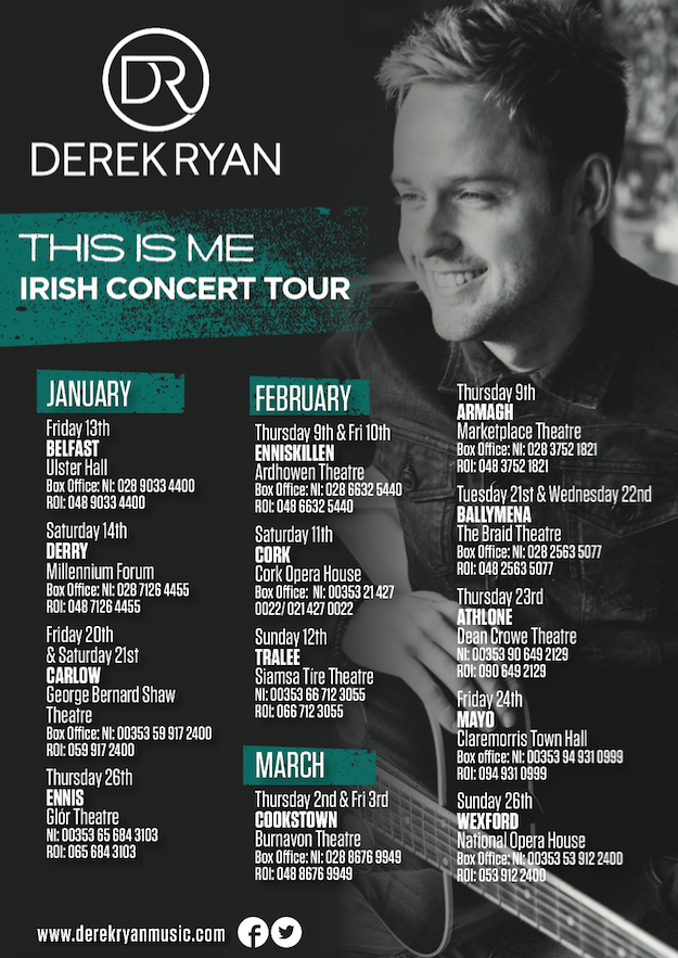 View Larger Image Derek Announces ‘This Is Me’ Irish Concert Tour TICKETS ON SALE NOW! By Richard|2025-10-01T10:58:03+00:00October 25, 2016|Uncategorized|0 Comments Share This Story, Choose Your Platform! FacebookXBlueskyRedditLinkedInWhatsAppTelegramTumblrXingEmailCopy Link About the Author: Richard Related Posts Derek releases new single ‘Batten Down The Hatches’ featuring Effie Neill Derek releases new single ‘Batten Down The Hatches’ featuring Effie Neill JUST ANNOUNCED! Irish Concert Tour 2026 – ON SALE NOW! JUST ANNOUNCED! Irish Concert Tour 2026 – ON SALE NOW! Derek releases The Nashville EP ‘It’s All Country’ Derek releases The Nashville EP ‘It’s All Country’ Derek releases new Nashville-recorded song ‘It’s All Country’ Derek releases new Nashville-recorded song ‘It’s All Country’ Leave A Comment Cancel replyComment Save my name, email, and website in this browser for the next time I comment. Please enter an answer in digits:thirteen − 8 =